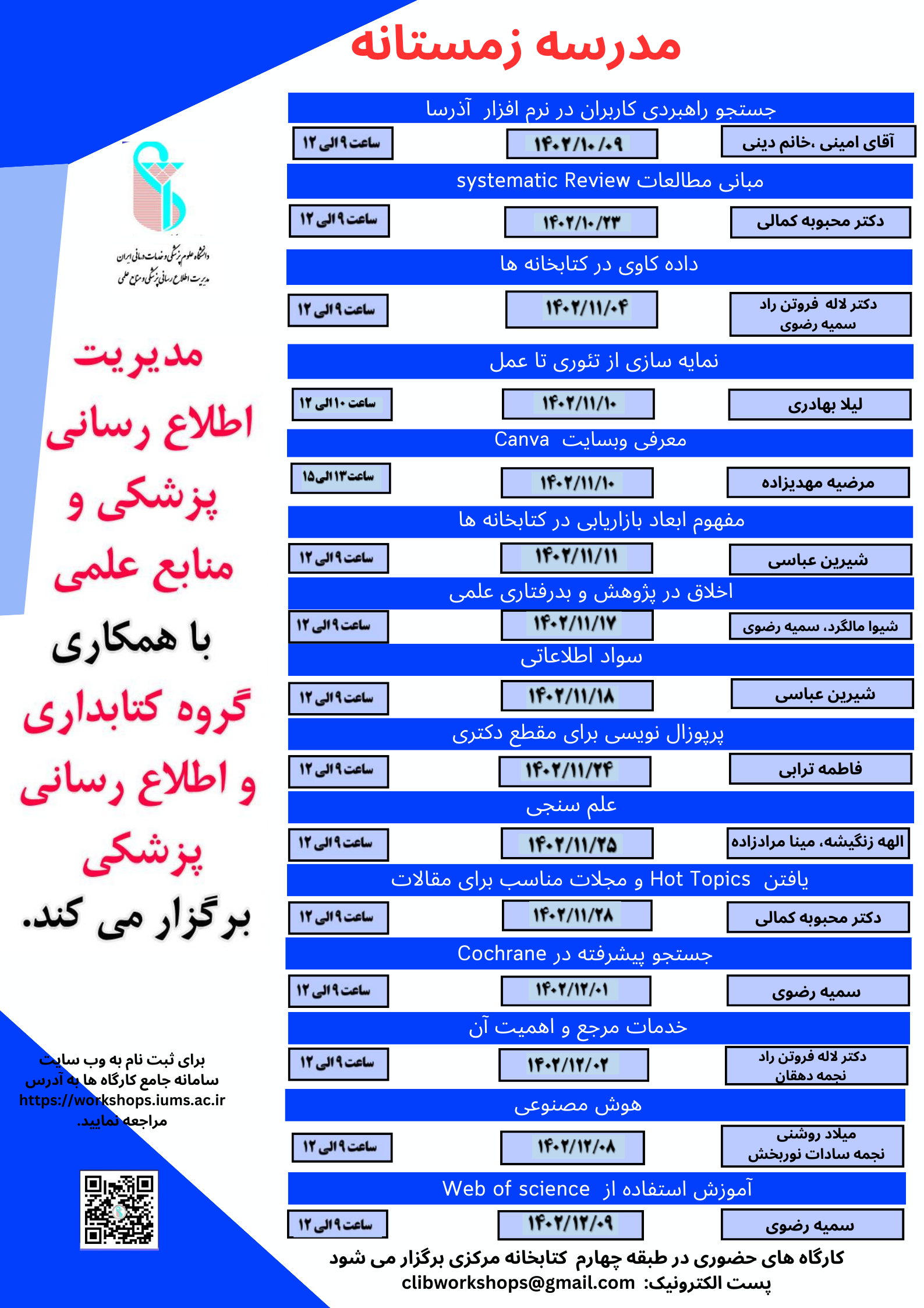 برنامه ی کارگاه های مدرسه زمستانه ی مدیریت اطلاع رسانی پزشکی اعلام شد.